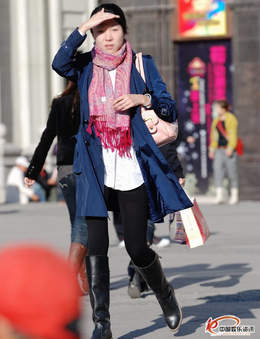 街拍的厚黑裤袜风衣长靴美女
