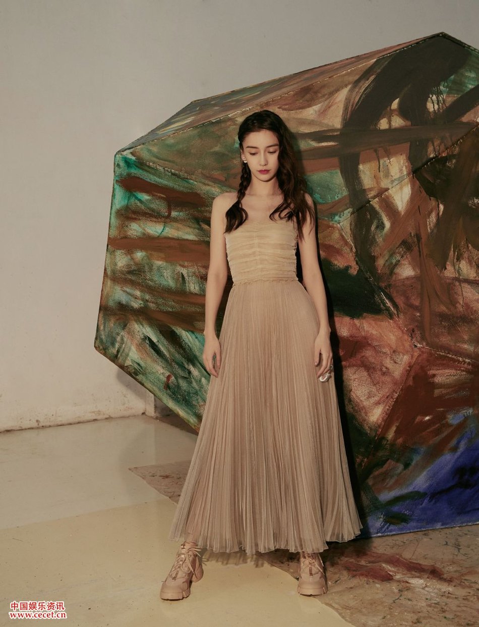 Angelababy裸色纱裙出席 露出香肩身材骨感