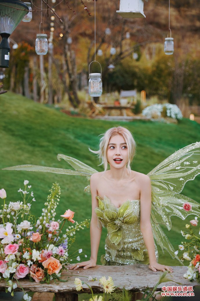 Angelababy生日派对 穿绿色抹胸裙搭配翅膀造型