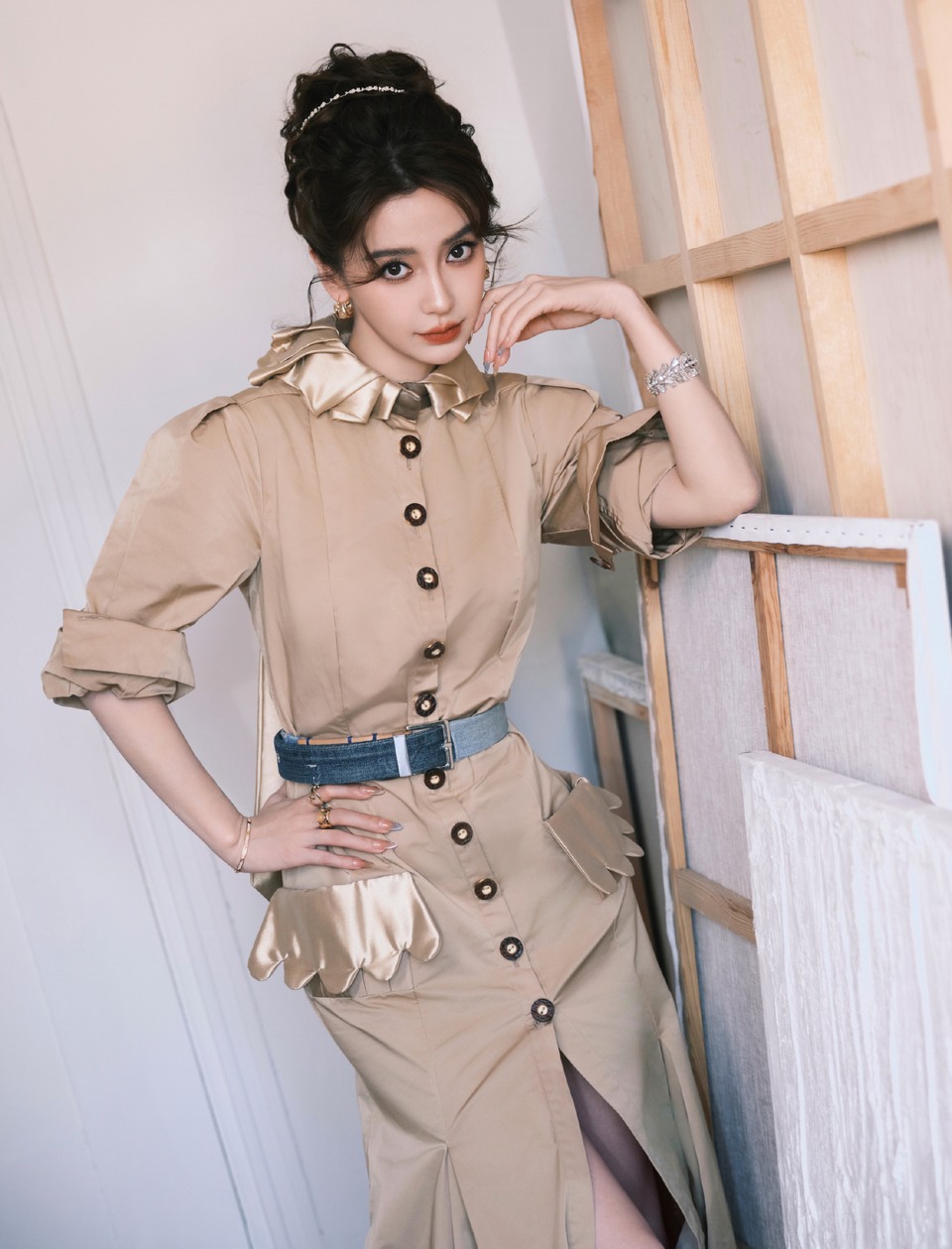 Angelababy暖金衣纹裹着沪上微风 优雅随步履漫延