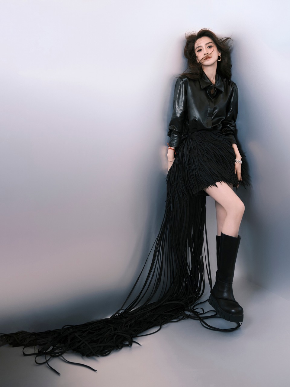 Angelababy光缕缠上皮质衣摆 浪漫因子在明暗褶皱里悄然生长