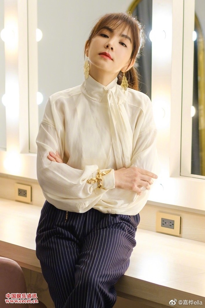 Ella穿着白色衬衫蓝色长裤休闲惬意感觉好美