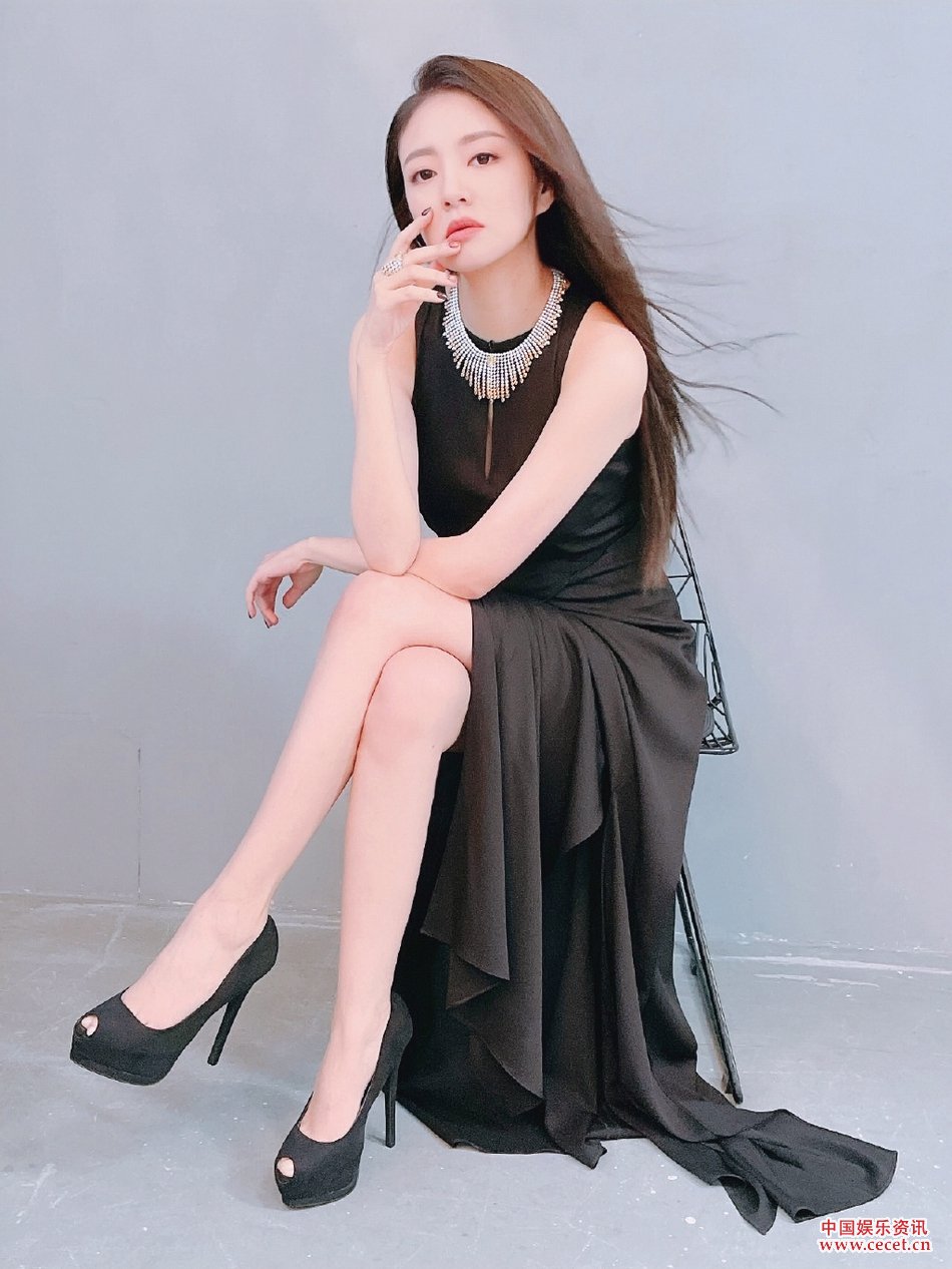 安以轩黑色开叉连衣裙 长发飘飘温婉知性