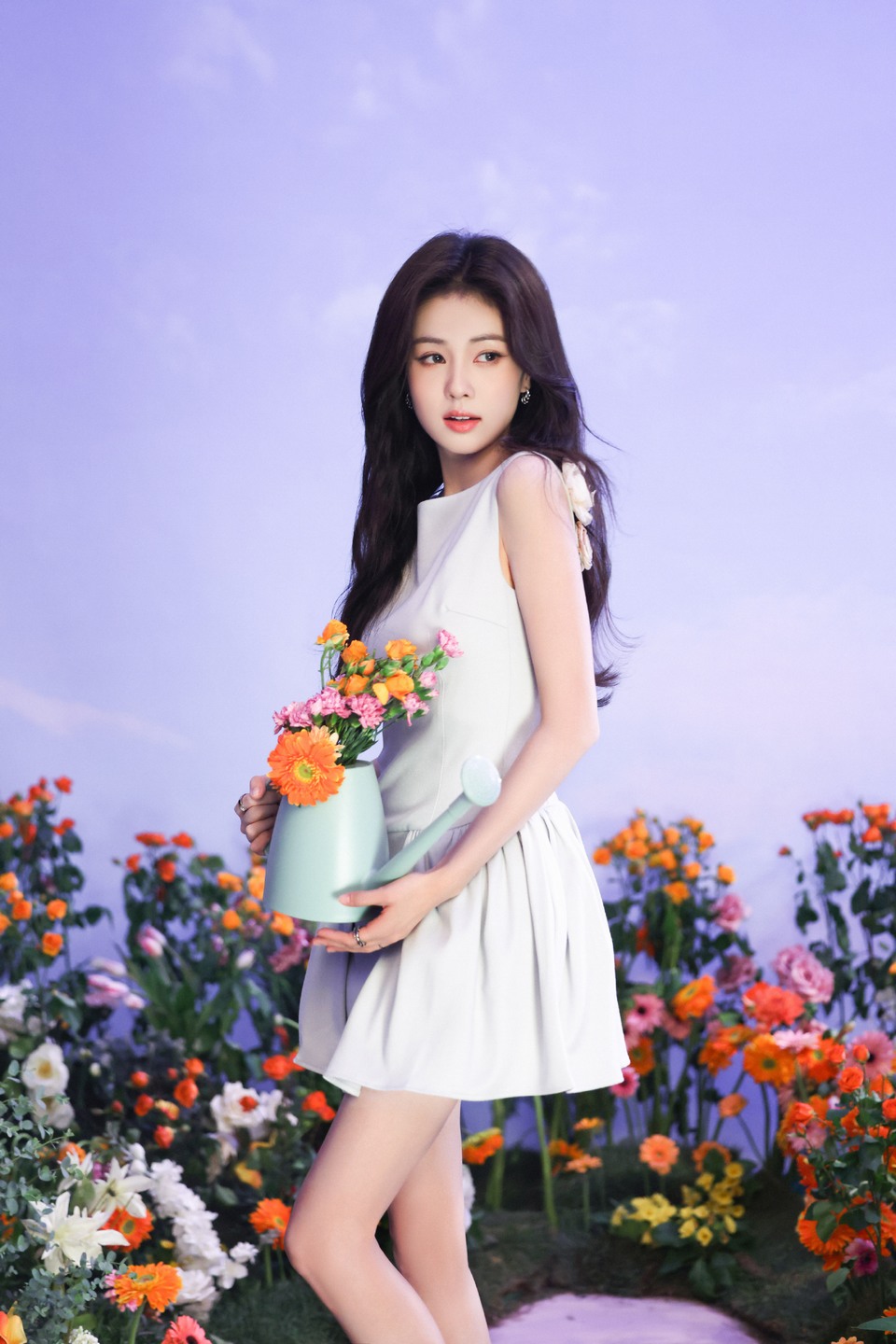 花坛抓拍的连衣裙白皙