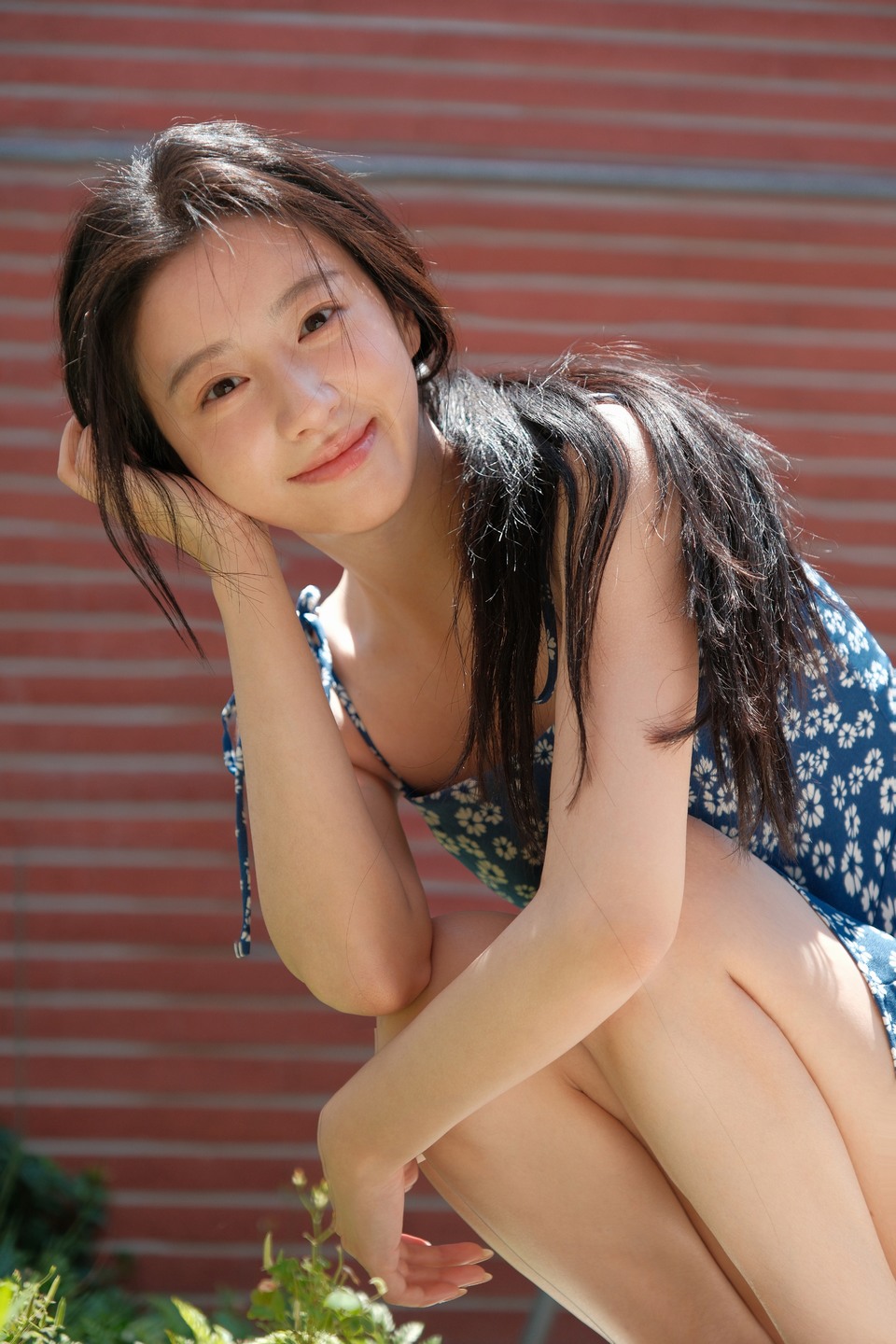 无袖蓝裙美眉美肌似玉