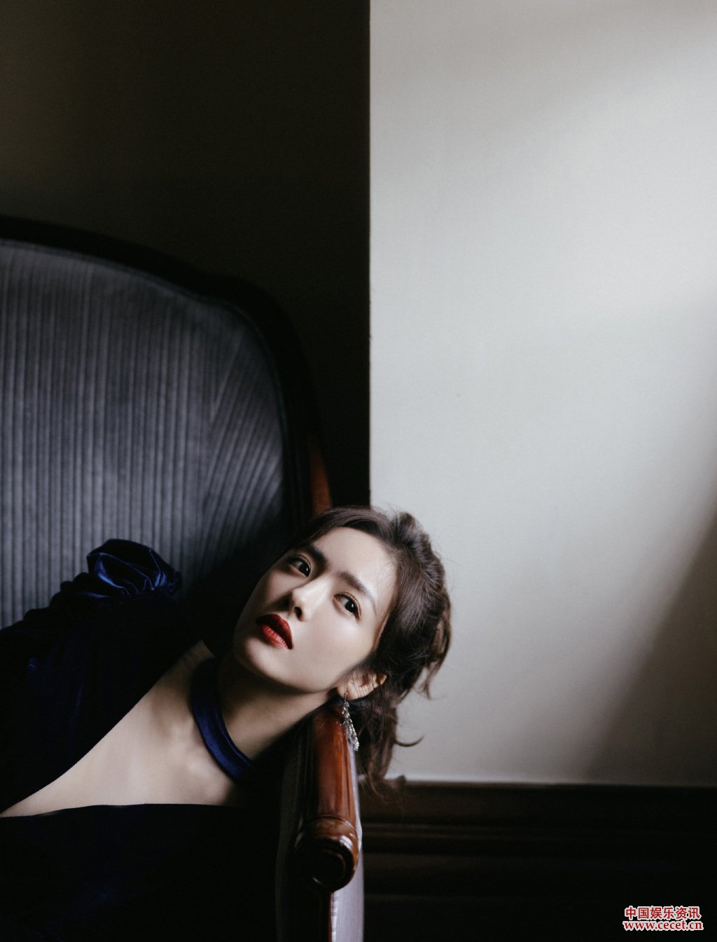 蔡文静蔚蓝丝绒礼服照 光影梦幻跳跃优雅炙热