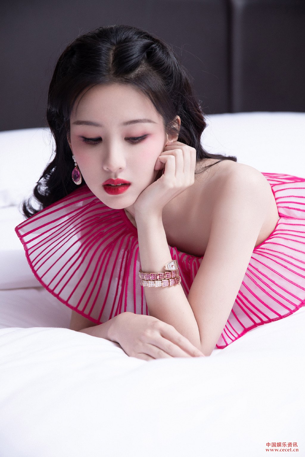 陈都灵粉色百褶荷叶长裙 眼波流转柔美动人