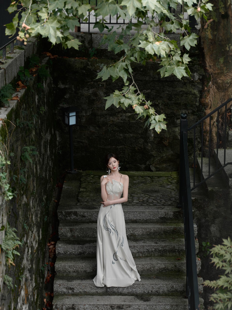 陈卓璇身着精致花纹礼裙 感受电影与山水交织的浪漫