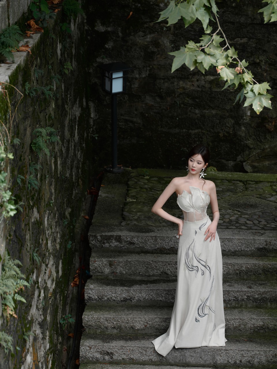 陈卓璇身着精致花纹礼裙 感受电影与山水交织的浪漫