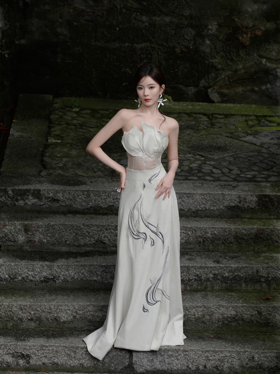 陈卓璇身着精致花纹礼裙 感受电影与山水交织的浪漫