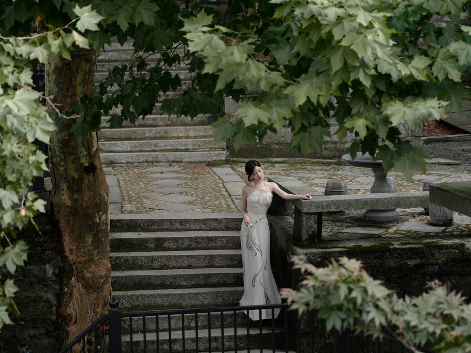 陈卓璇身着精致花纹礼裙 感受电影与山水交织的浪漫