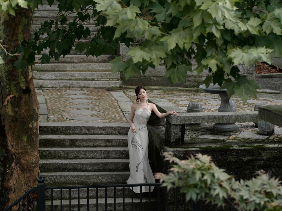 陈卓璇身着精致花纹礼裙 感受电影与山水交织的浪漫