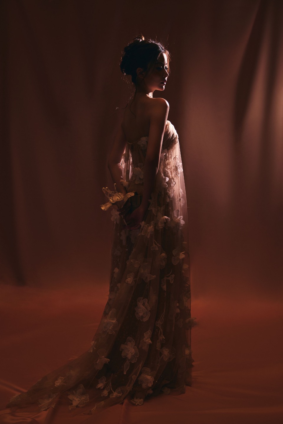 陈卓璇裸色纱裙裹挟温柔光晕 立体花簇似梦境绽放