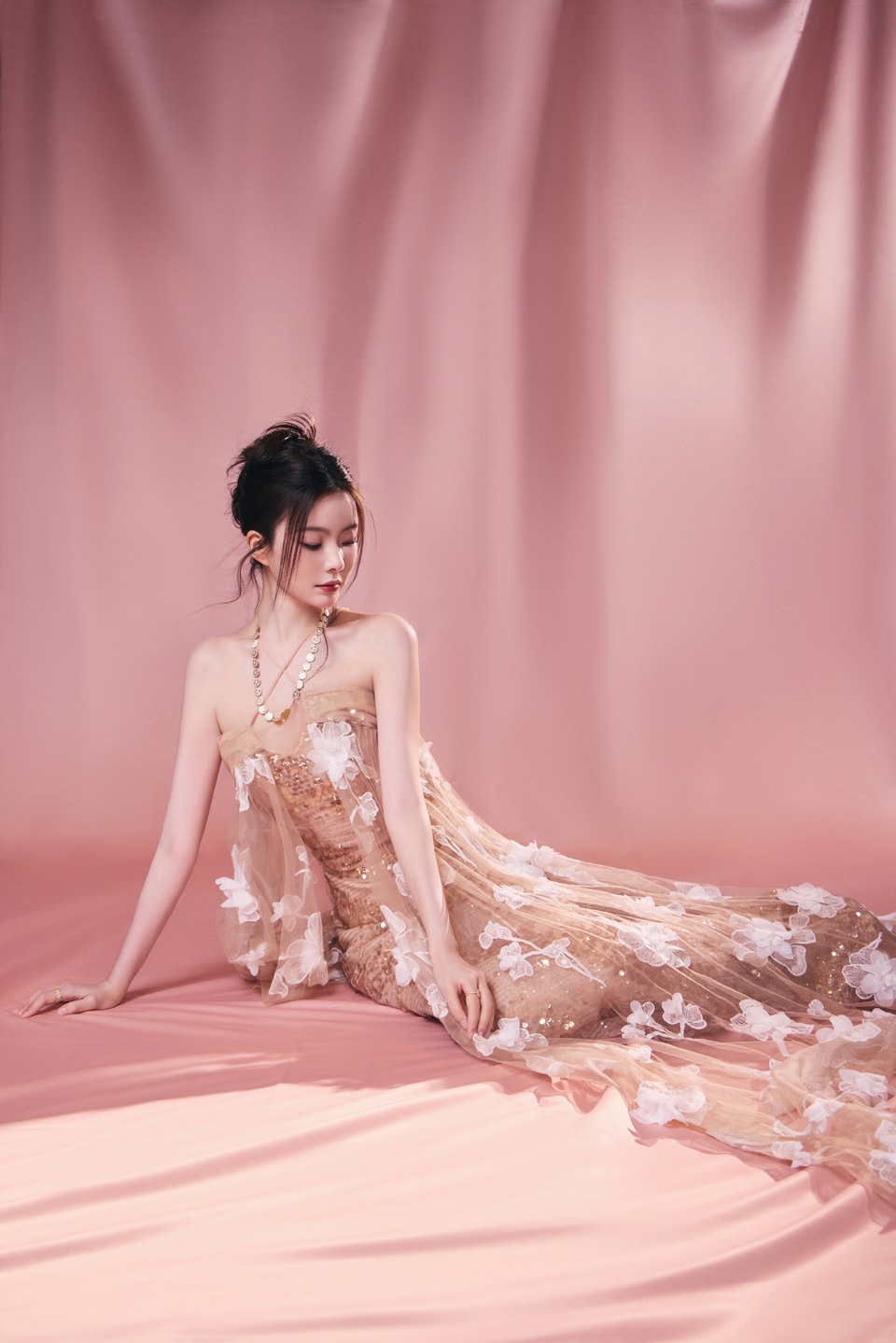 陈卓璇裸色纱裙裹挟温柔光晕 立体花簇似梦境绽放