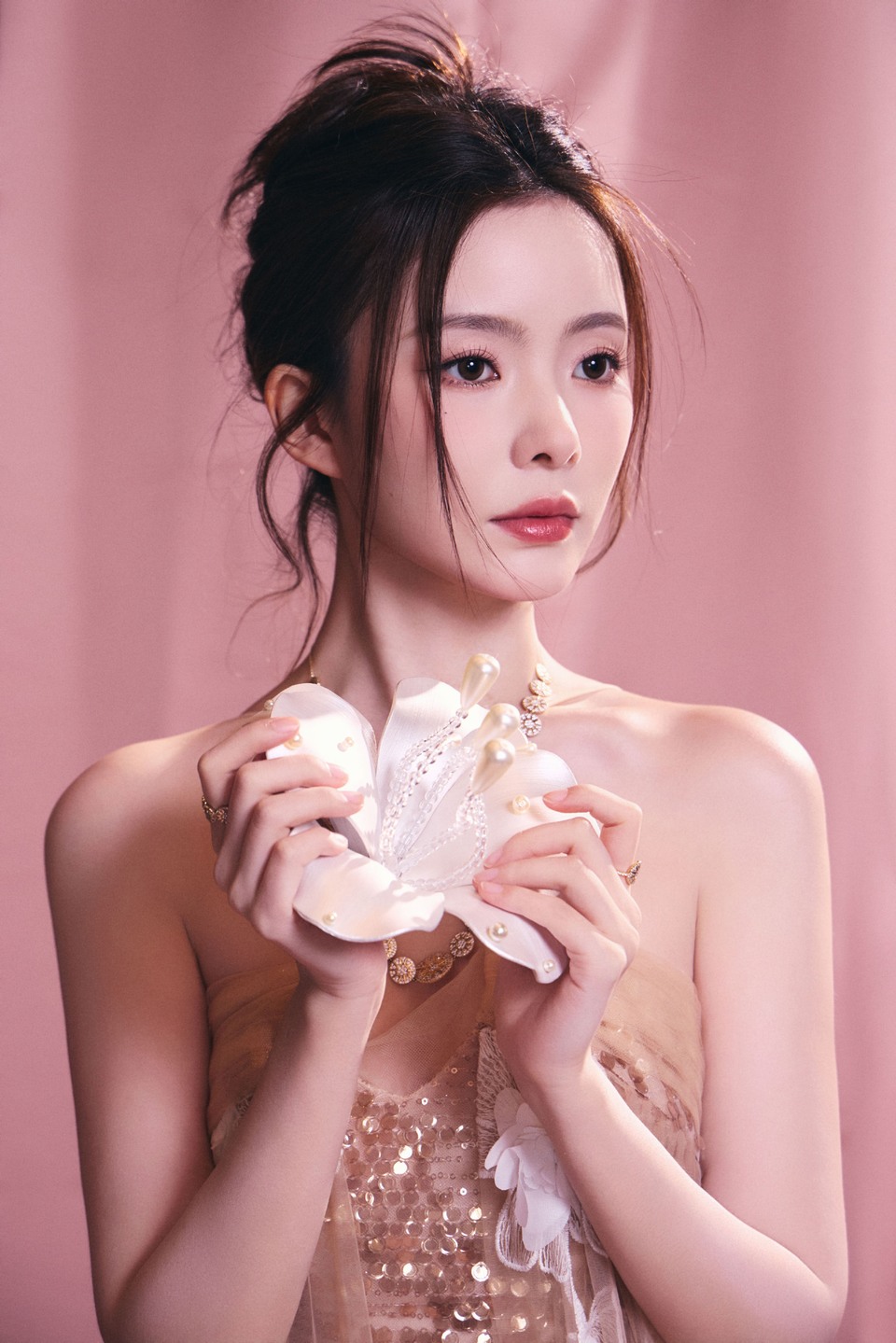 陈卓璇裸色纱裙裹挟温柔光晕 立体花簇似梦境绽放