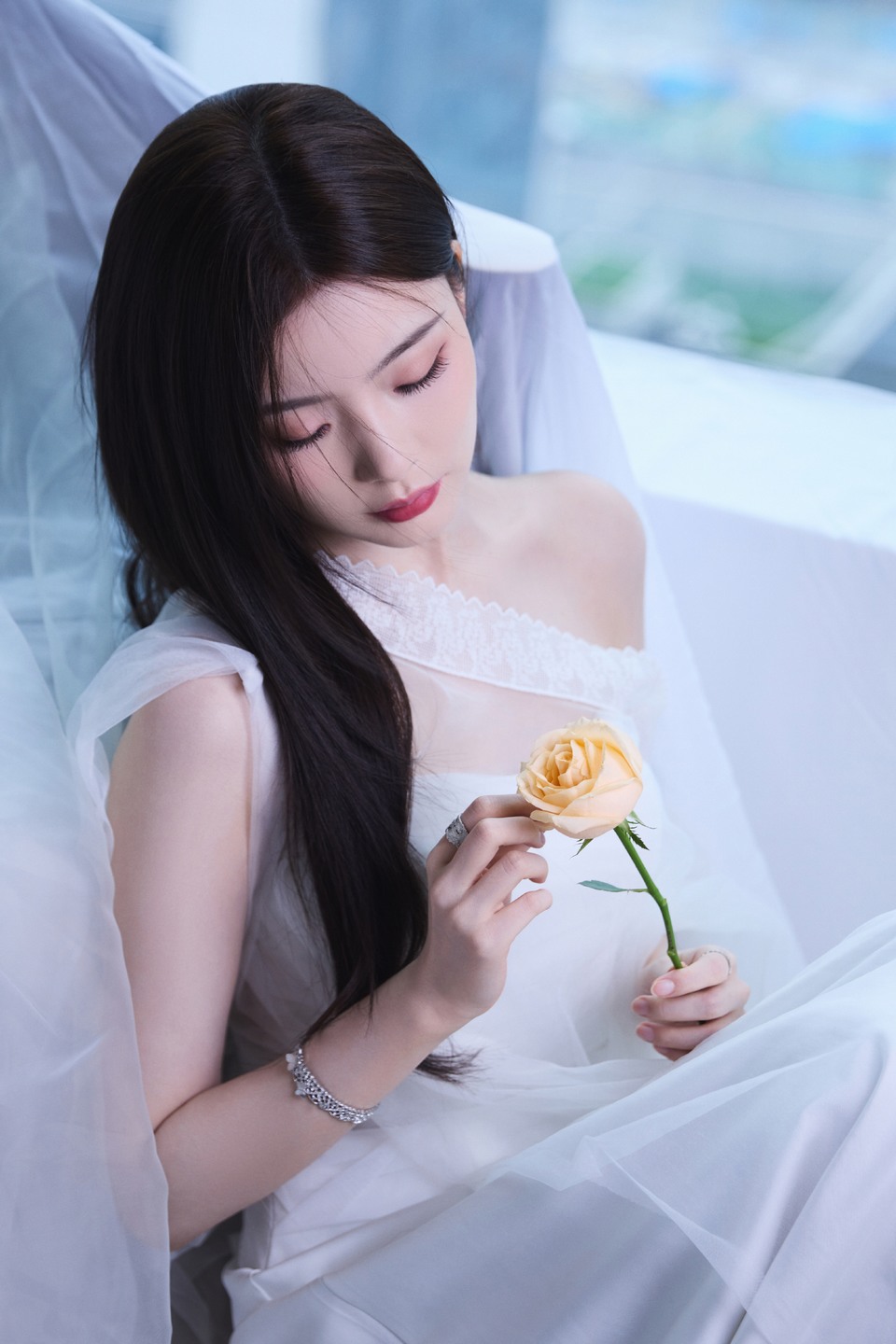 陈卓璇一袭白纱缀以蕾丝细语 薄纱随旋律轻漾成诗篇