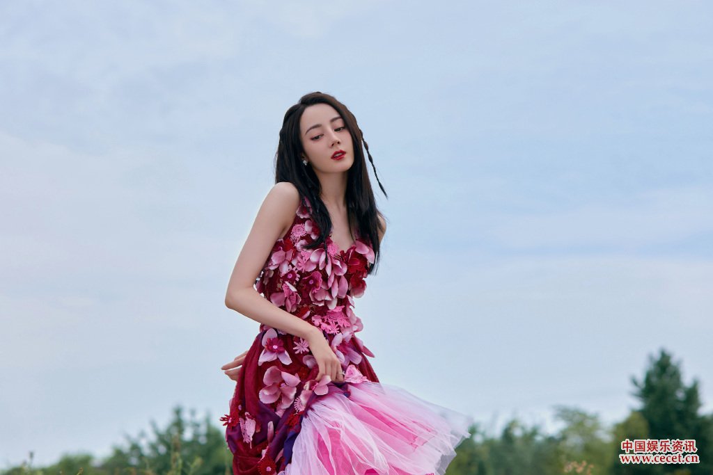 迪丽热巴身着粉红立体花朵连衣裙摇曳多姿