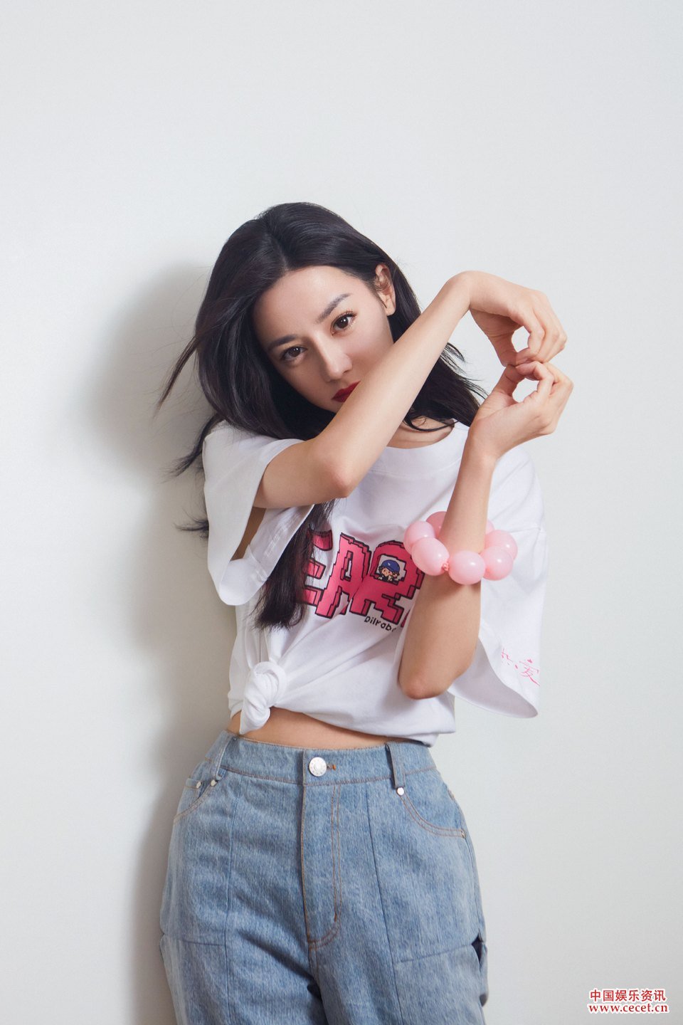 迪丽热巴身穿白色「Dear」T恤展露明媚笑颜