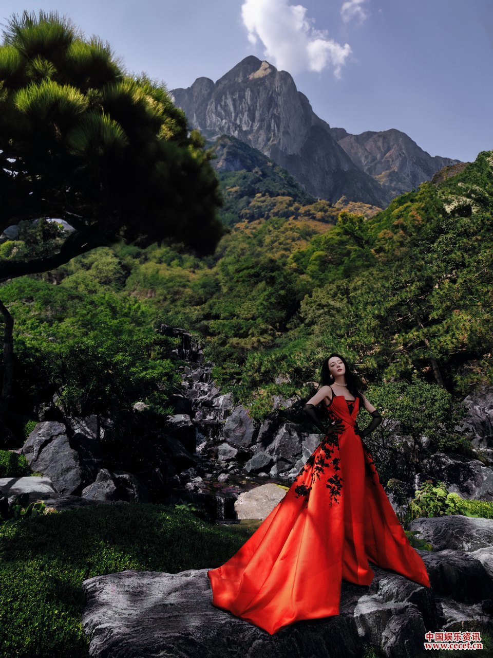 迪丽热巴一袭红色钉珠刺绣礼服置身山水之间