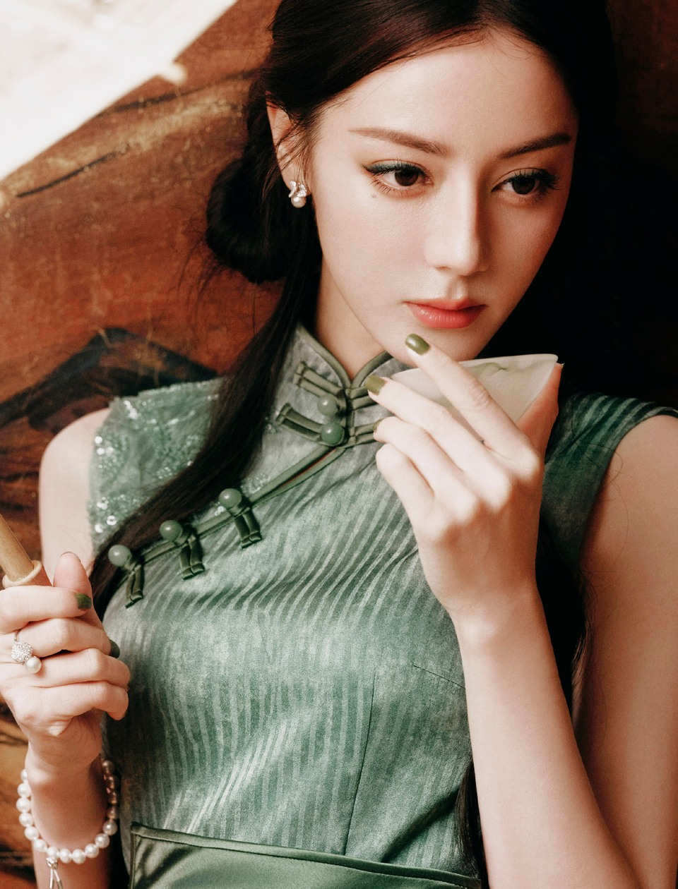 迪丽热巴罗扇轻摇玉盏茶香 青衫纸伞朦胧雅致