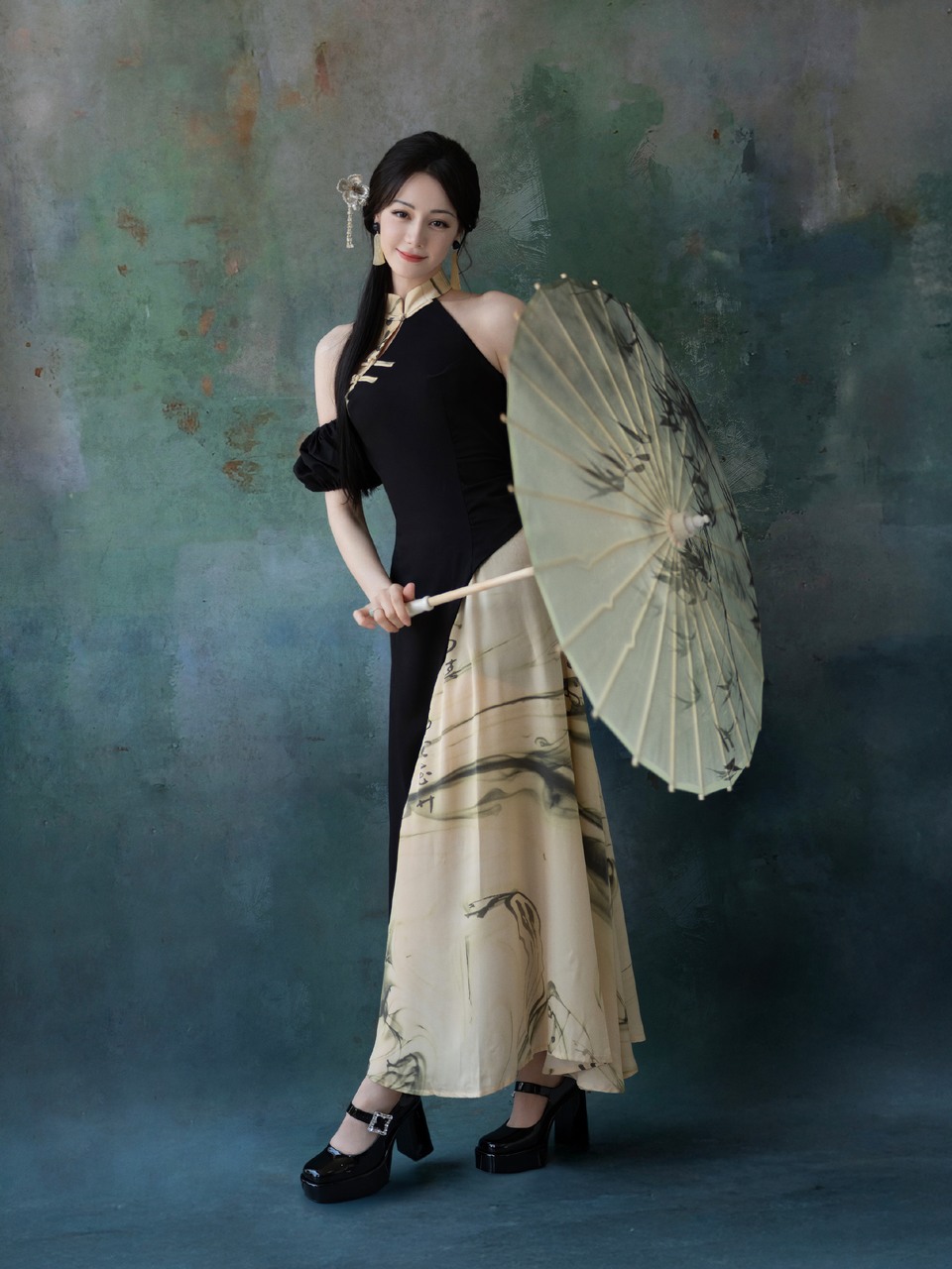 迪丽热巴水墨光影交错 挥扇半掩花枝展清绝