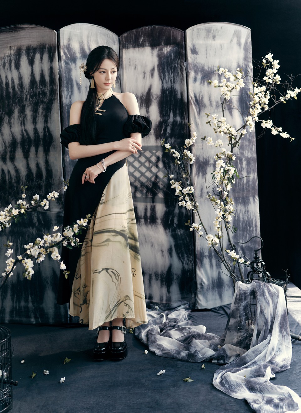 迪丽热巴水墨光影交错 挥扇半掩花枝展清绝