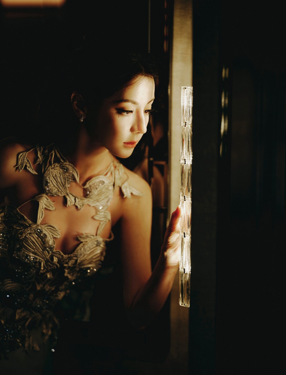 迪丽热巴雾蓝裙摆漾起优雅涟漪 花卉刺绣流光漫溢