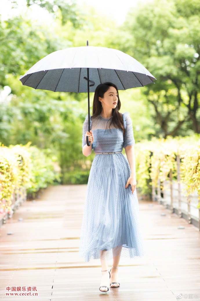 董璇蓝色纱裙撑伞漫步 对镜回眸侧颜温柔优雅