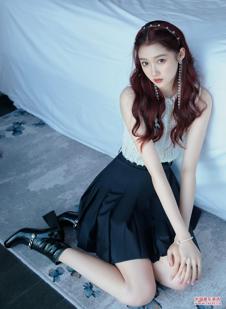 关晓彤穿白色蕾丝上衣搭黑色短裙美腿纤细