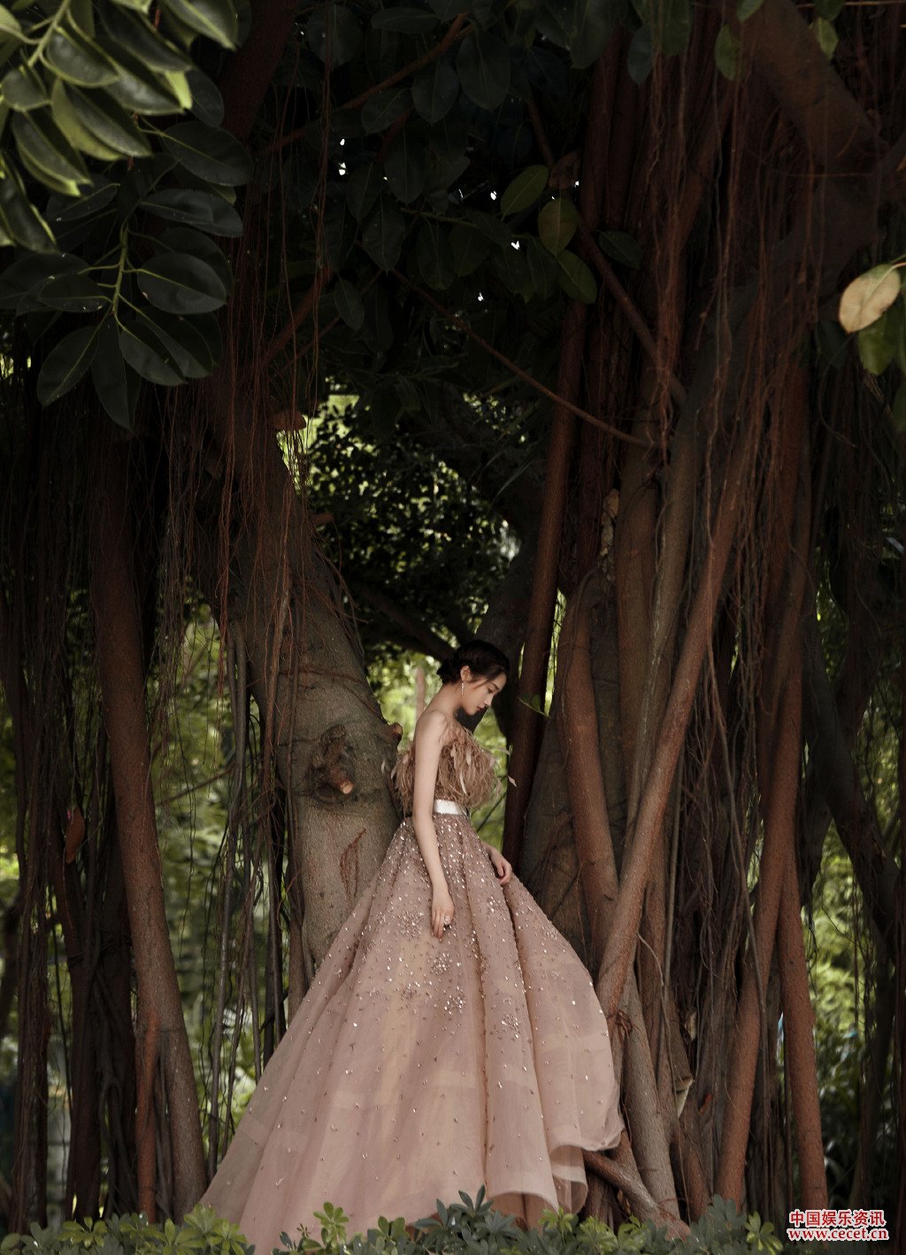 关晓彤粉金羽毛长裙照 造型优美如林间精灵