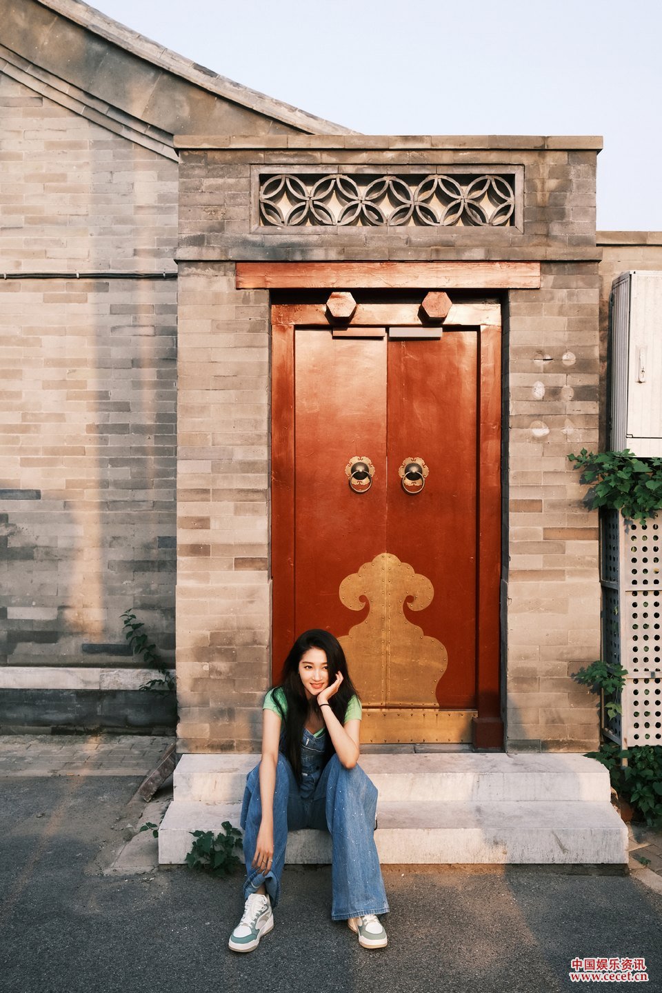 关晓彤背带裤造型 逛胡同骑单车共享惬意悠然