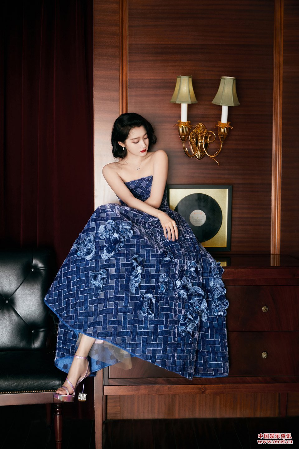 关晓彤一袭蓝色花朵裙 裙上生花复古优雅