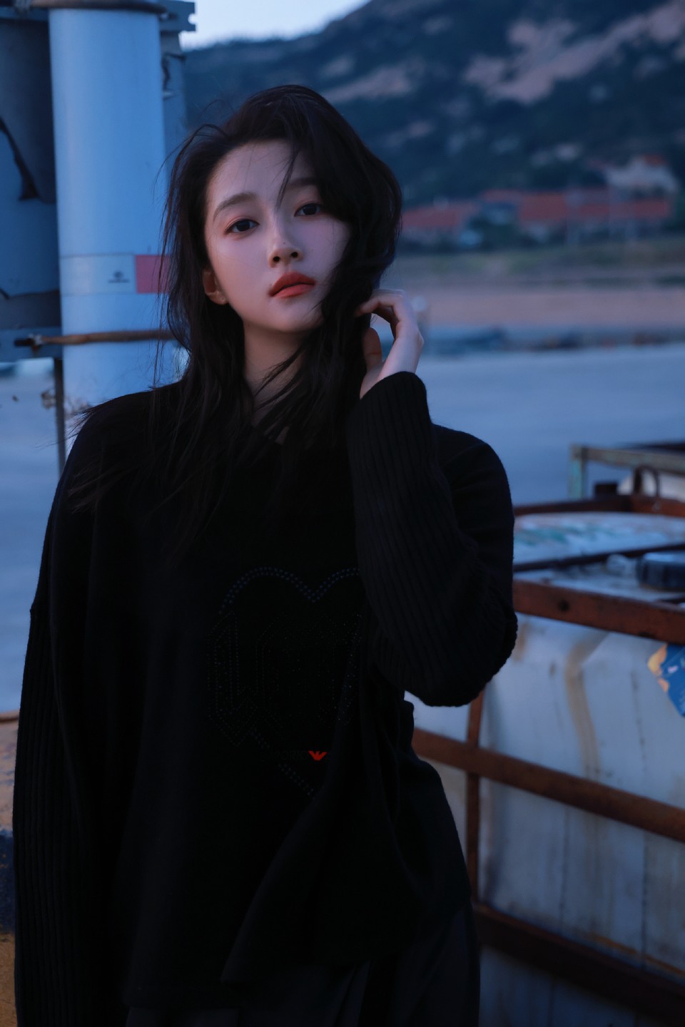 关晓彤漫步在码头 日落后的蓝调时刻美到发光