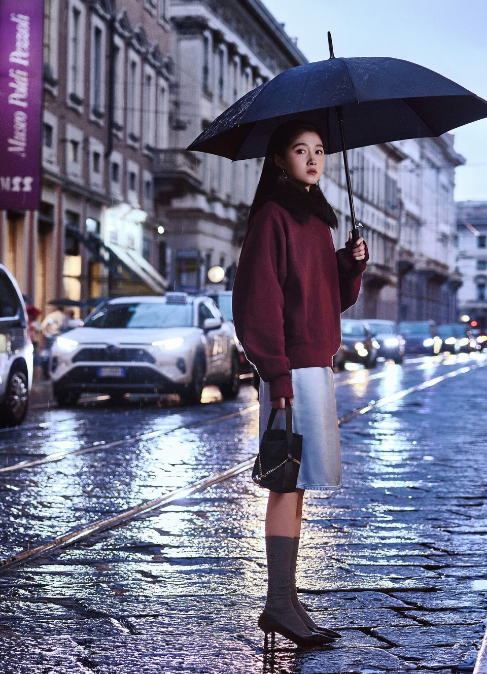 关晓彤撑着伞漫步在米兰的雨夜 穿梭在熙熙攘攘的街道