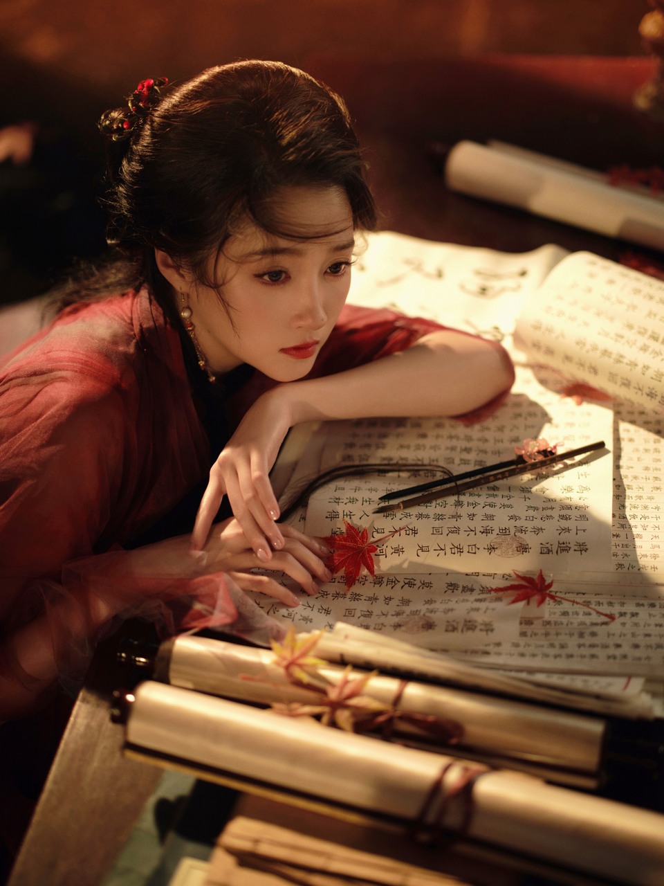 关晓彤枫树林里的古风美人 提笔写诗仿佛在等待