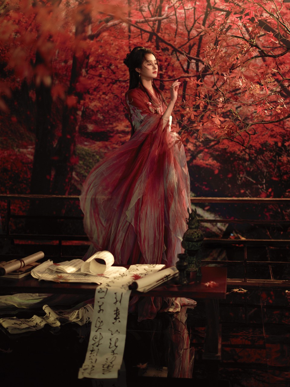 关晓彤枫树林里的古风美人 提笔写诗仿佛在等待