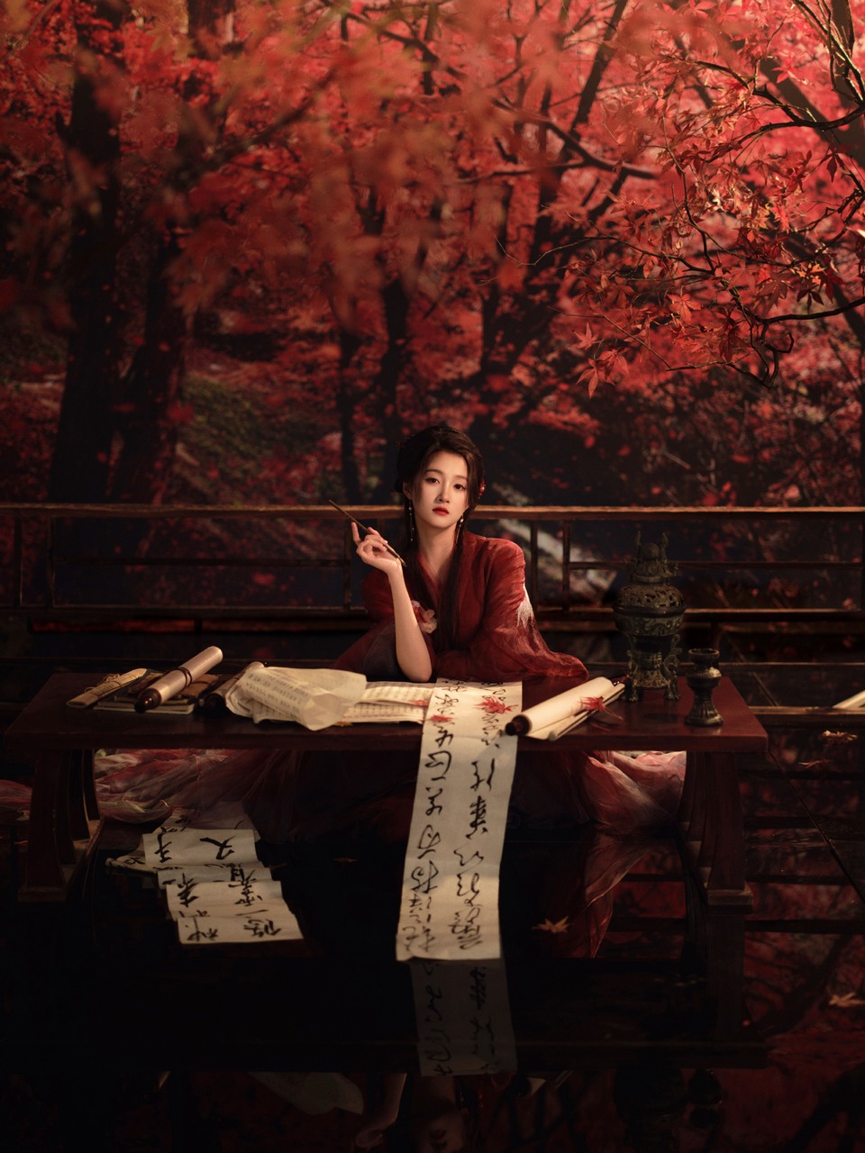 关晓彤枫树林里的古风美人 提笔写诗仿佛在等待