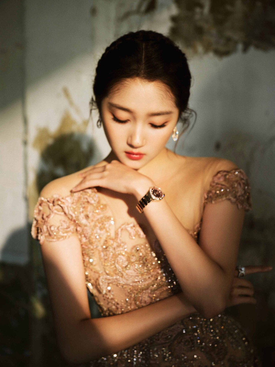 关晓彤身穿香槟粉鎏金纱裙的少女回眸 像一幅油画
