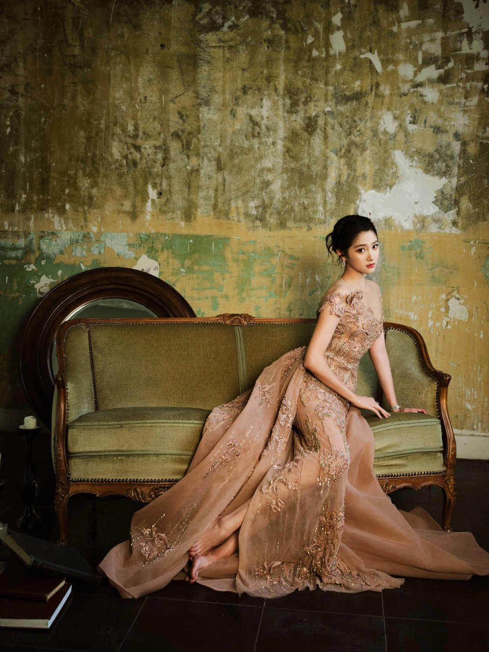 关晓彤身穿香槟粉鎏金纱裙的少女回眸 像一幅油画