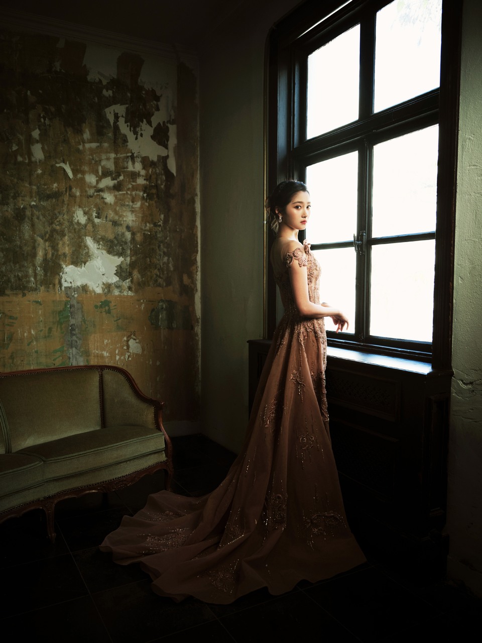 关晓彤身穿香槟粉鎏金纱裙的少女回眸 像一幅油画