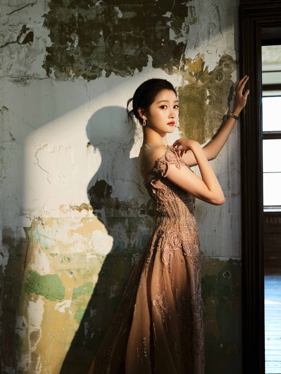 关晓彤身穿香槟粉鎏金纱裙的少女回眸 像一幅油画