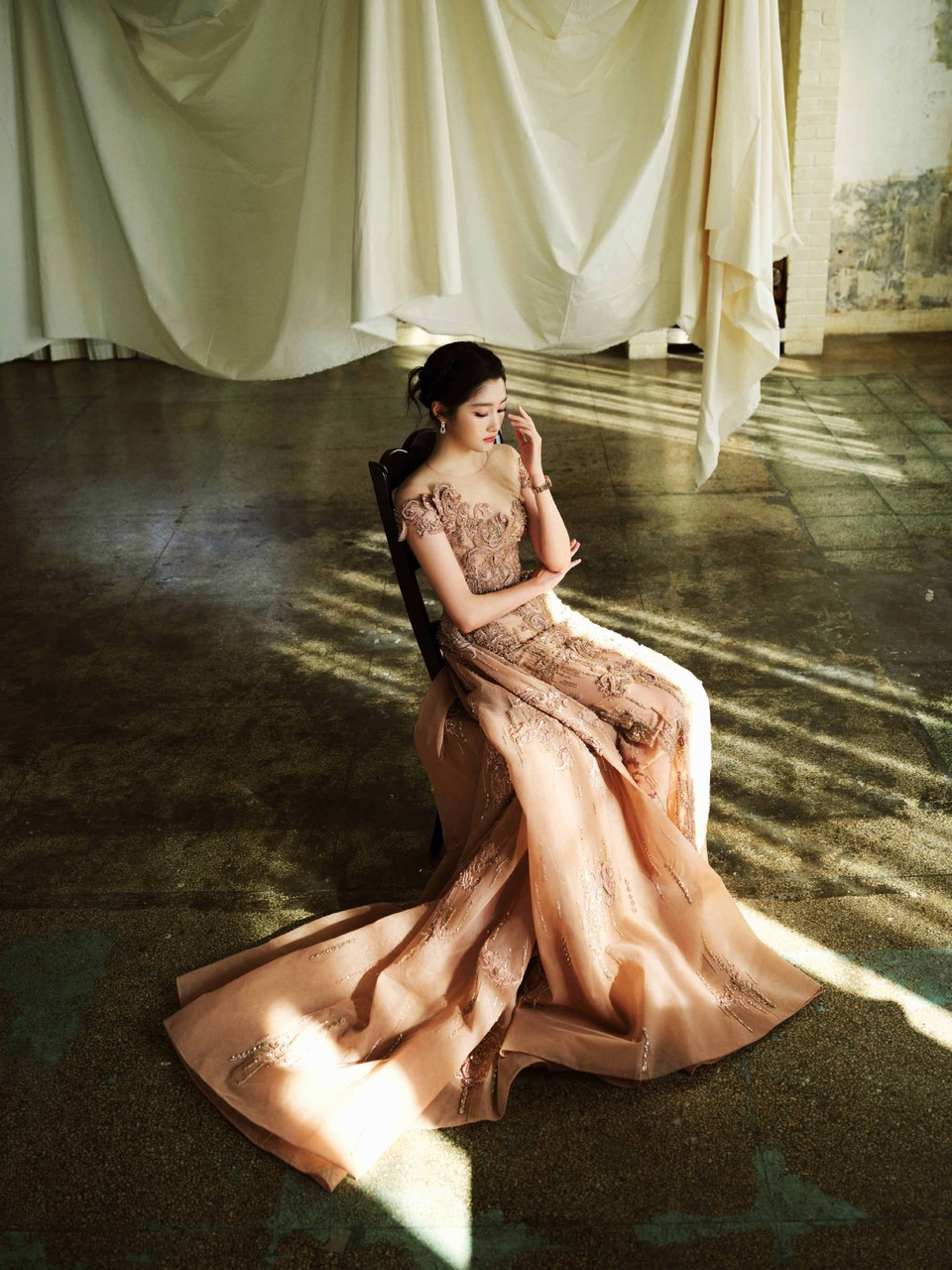关晓彤身穿香槟粉鎏金纱裙的少女回眸 像一幅油画
