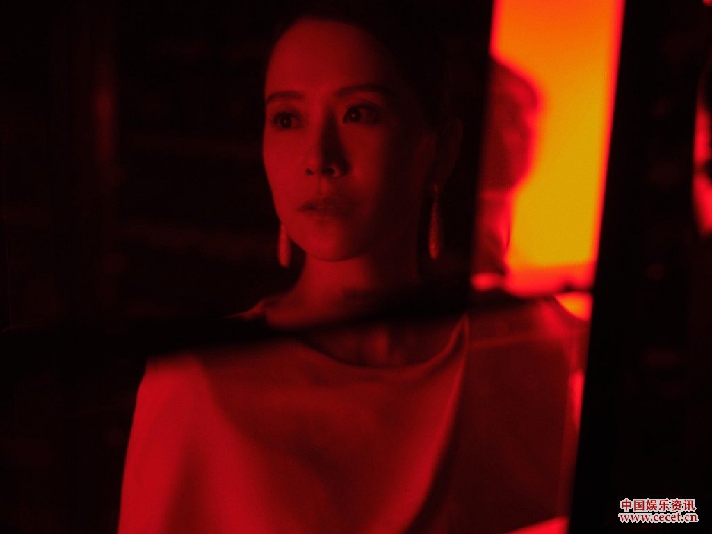 海清一身白色长裙穿梭在酒红色光影里自信大方