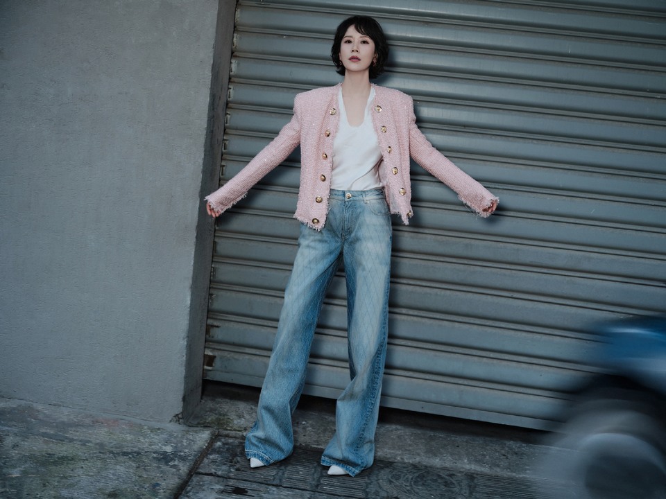海清粉色夹克搭配复古牛仔 温柔与力量同频共振