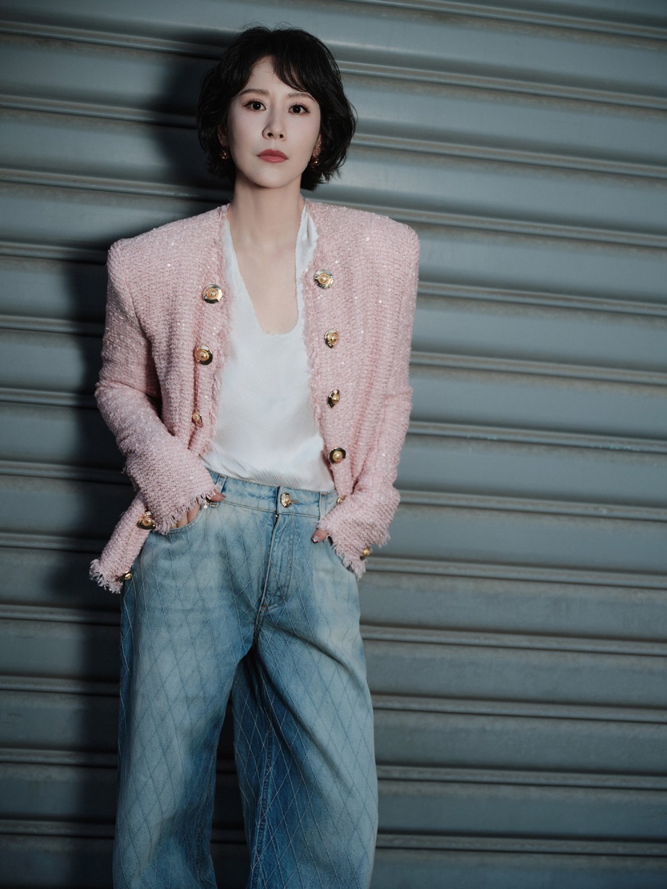海清粉色夹克搭配复古牛仔 温柔与力量同频共振
