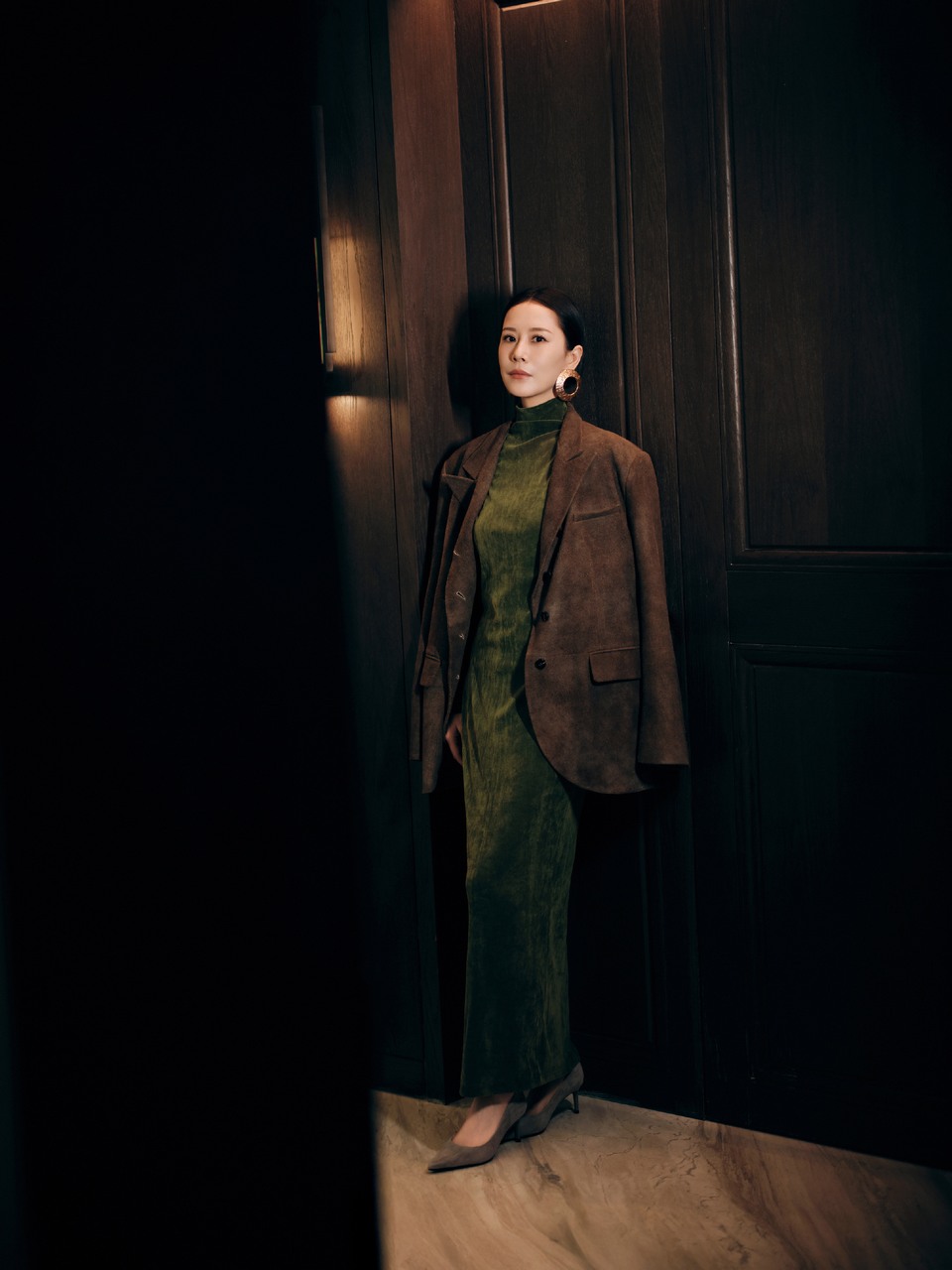 海清身着复古棕麂皮西装搭配墨绿丝绒套装现身