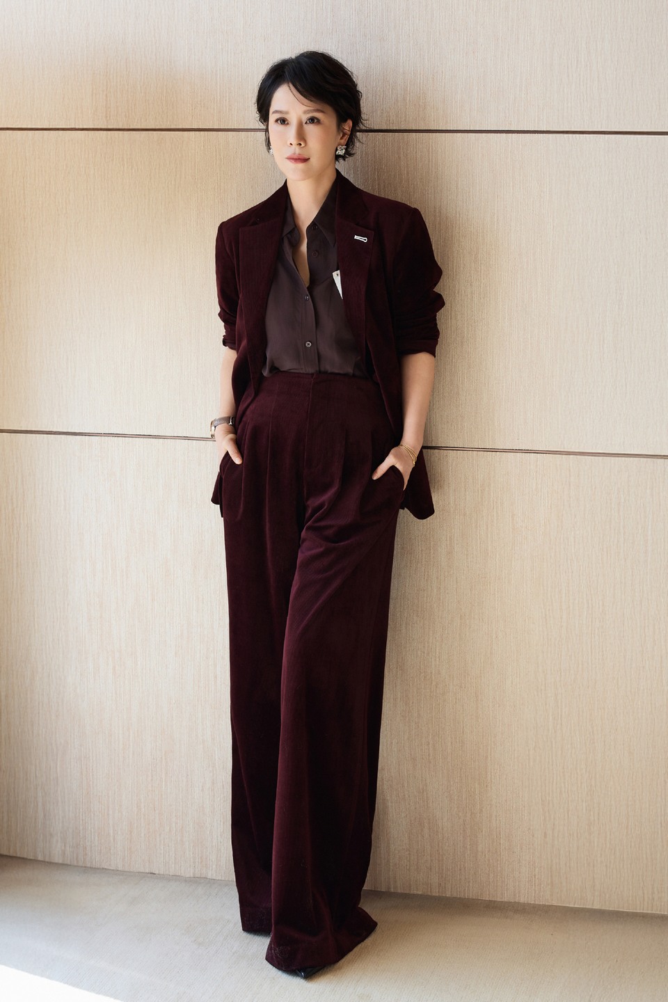 海清酒红丝绒西装随性自在 利落剪裁搭配丝绒质感