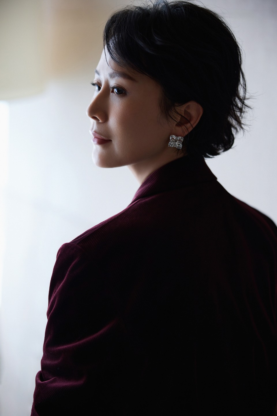 海清酒红丝绒西装随性自在 利落剪裁搭配丝绒质感