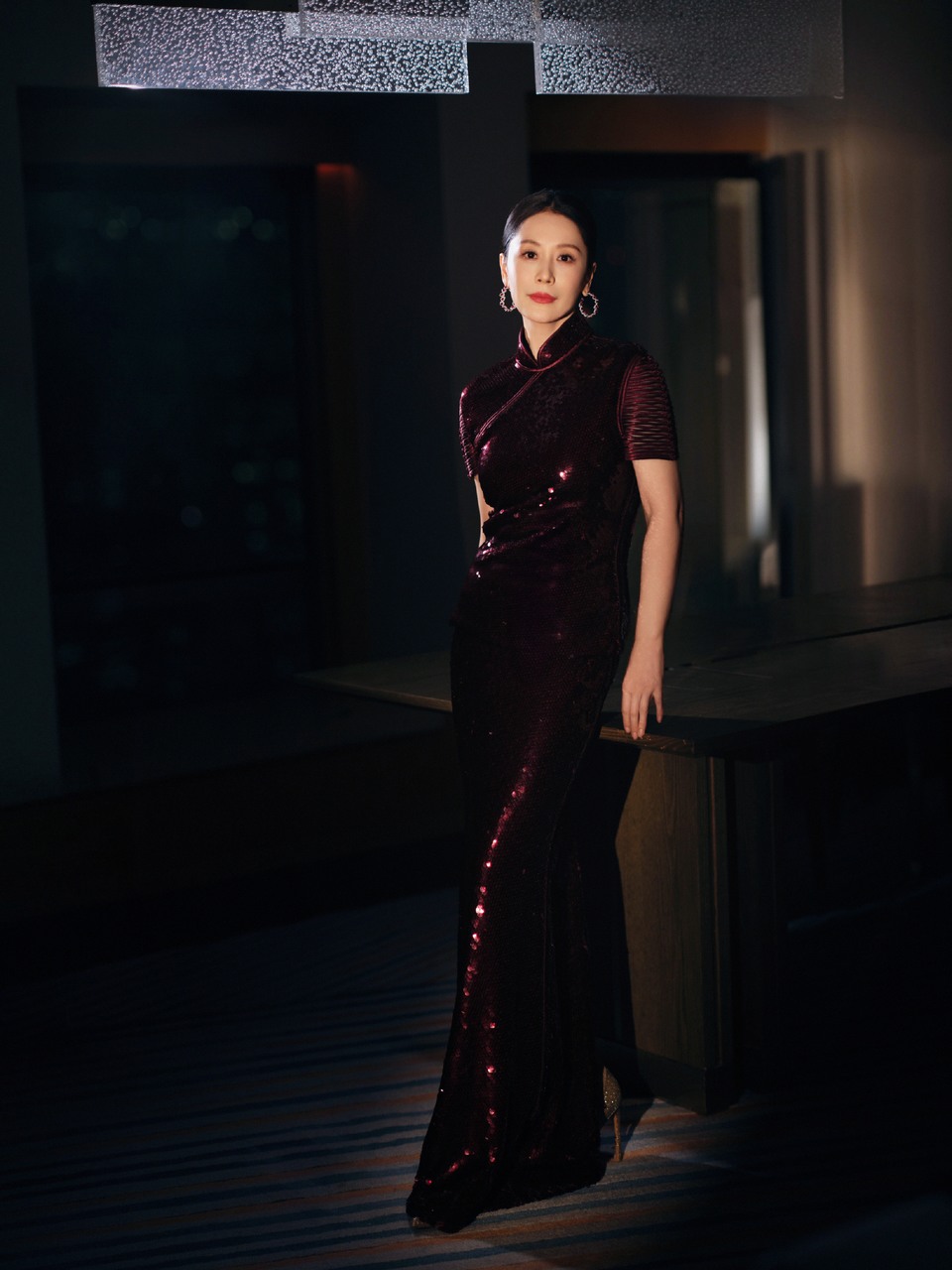 海清深酒红色亮片旗袍式长裙 勾勒出东方风骨