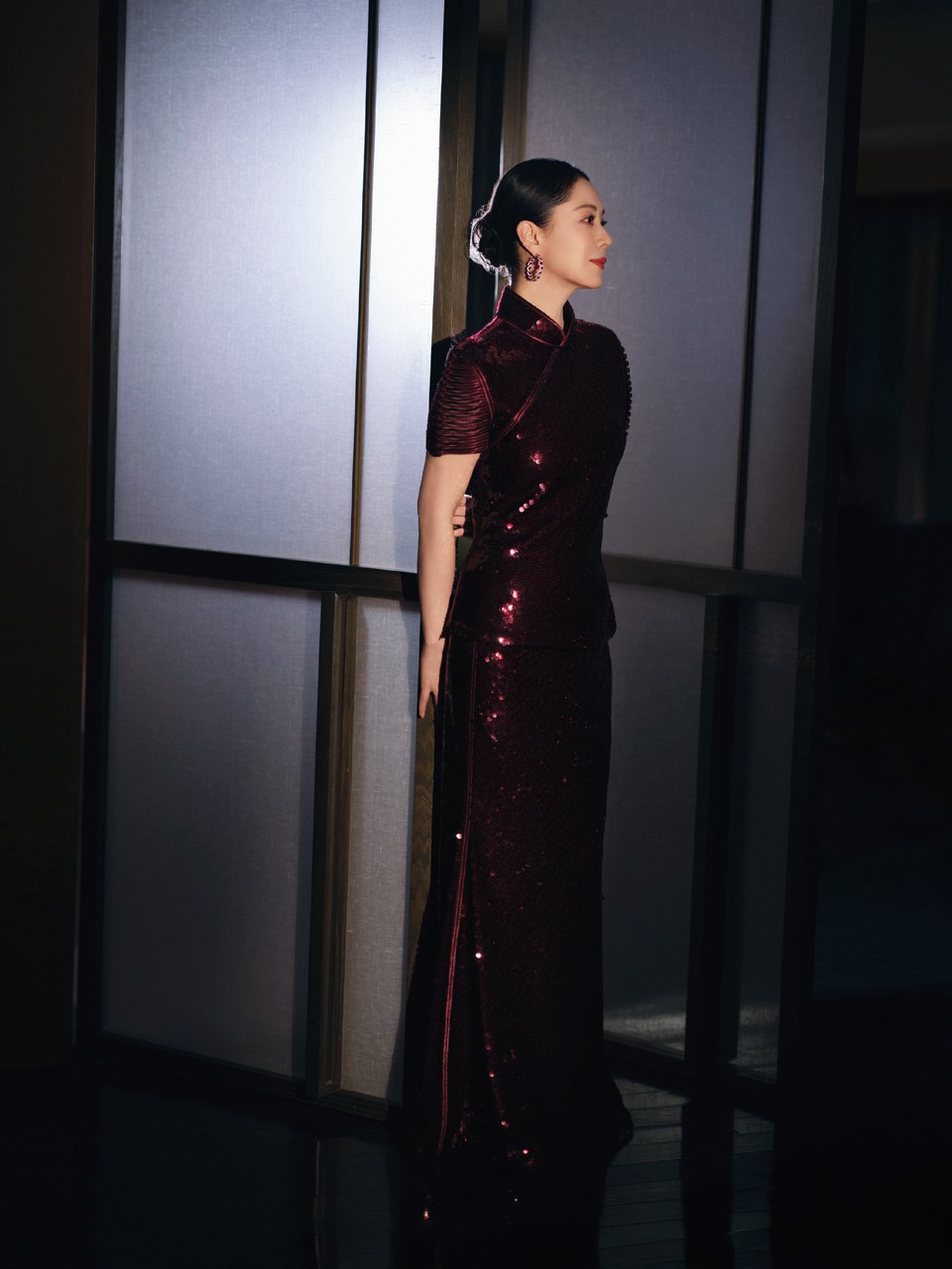 海清深酒红色亮片旗袍式长裙 勾勒出东方风骨
